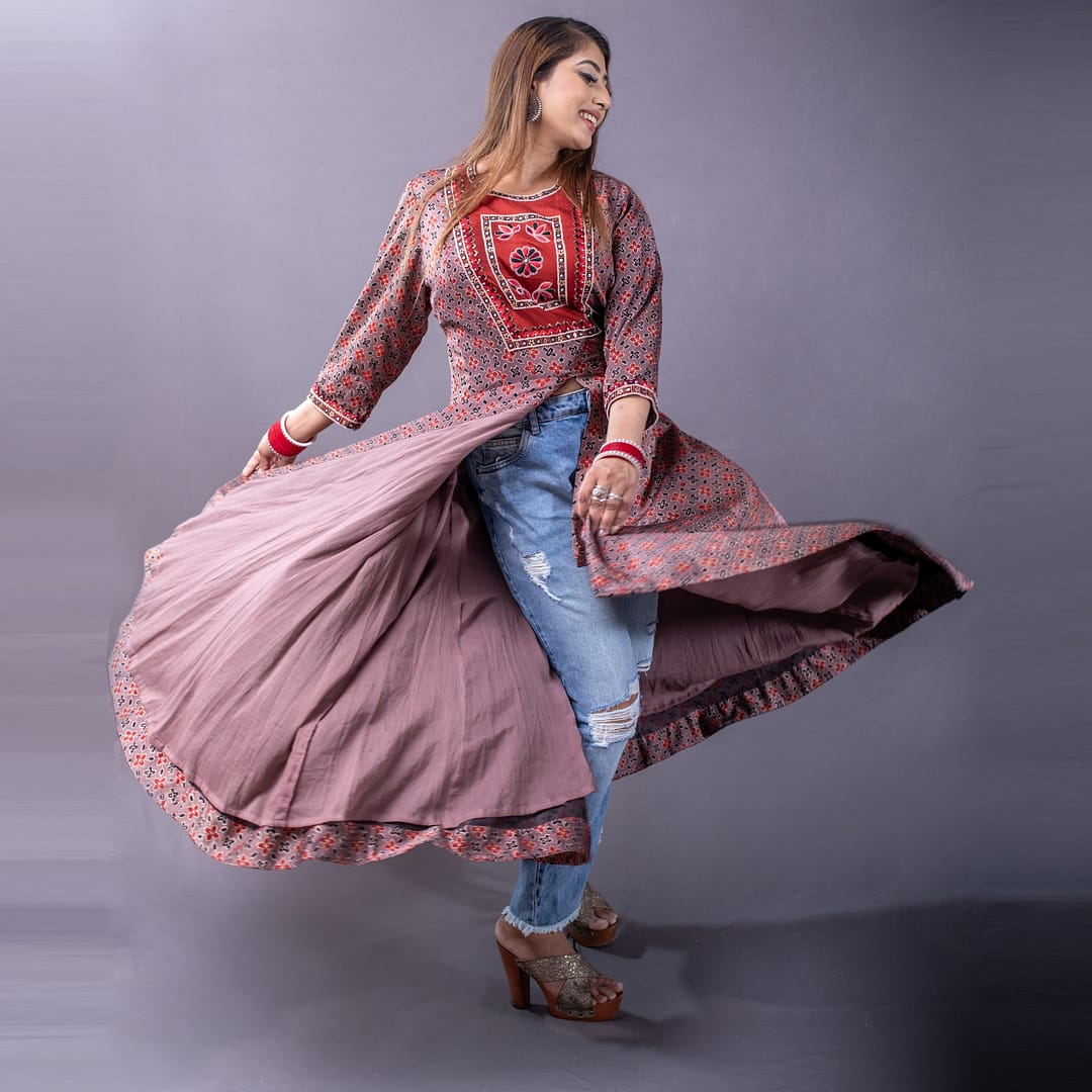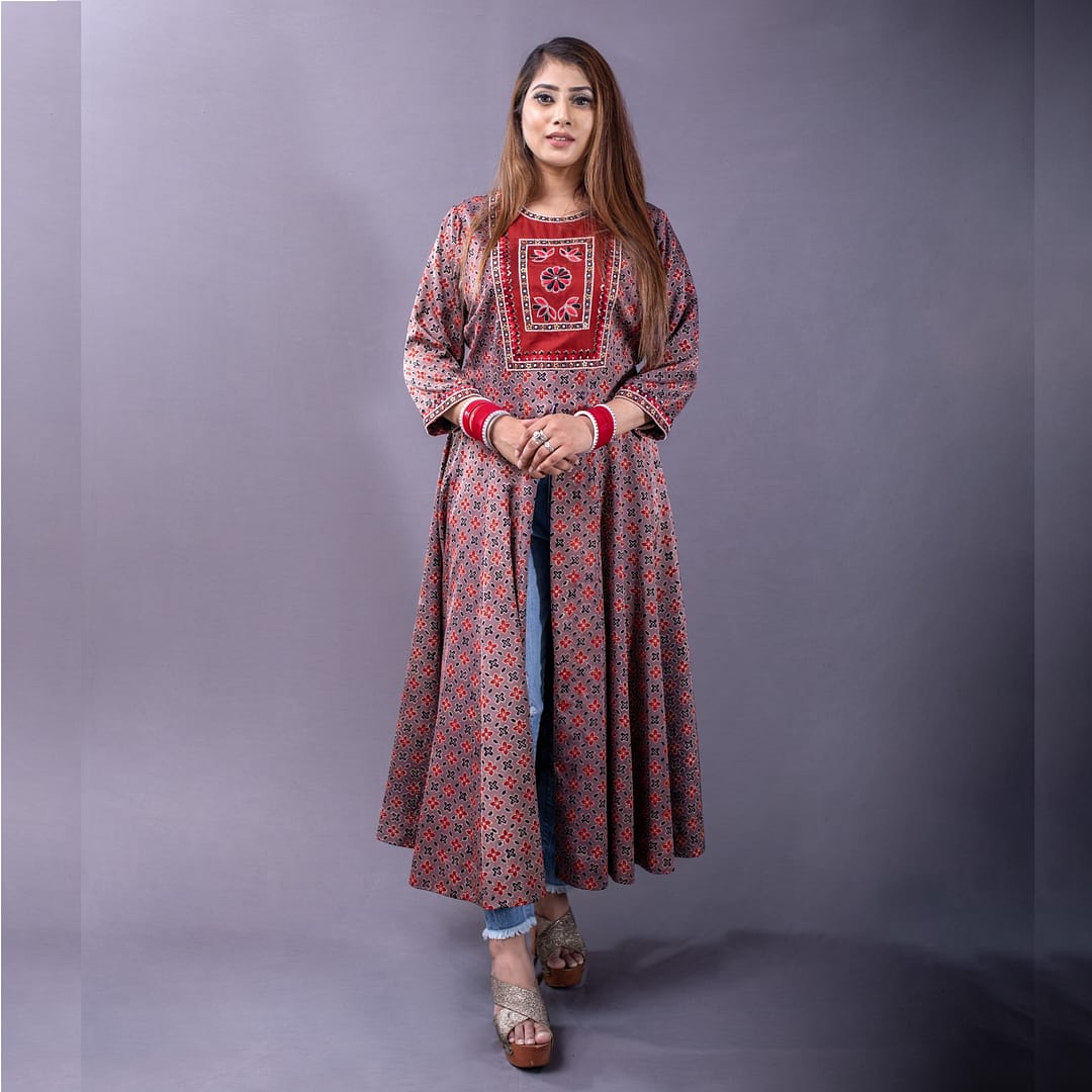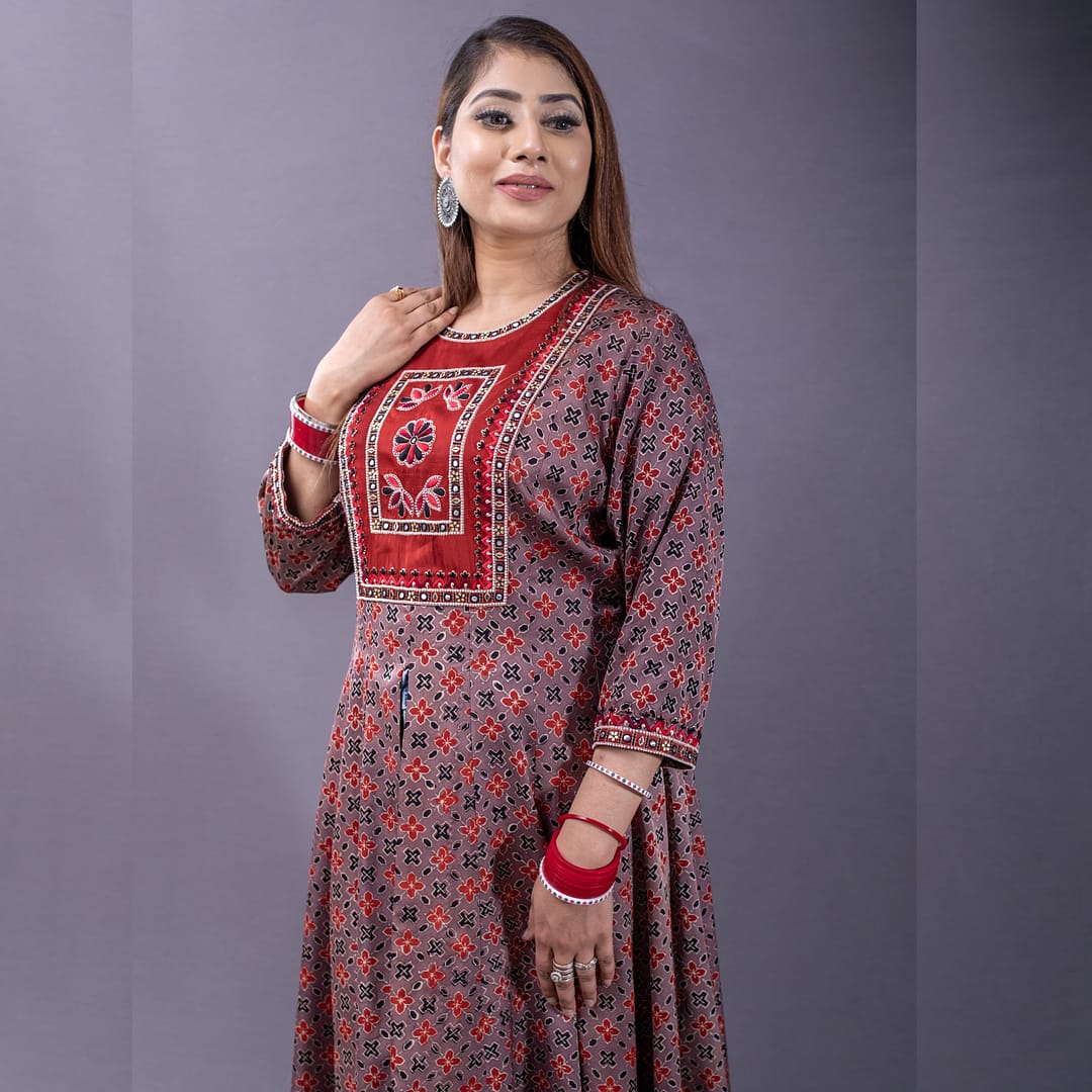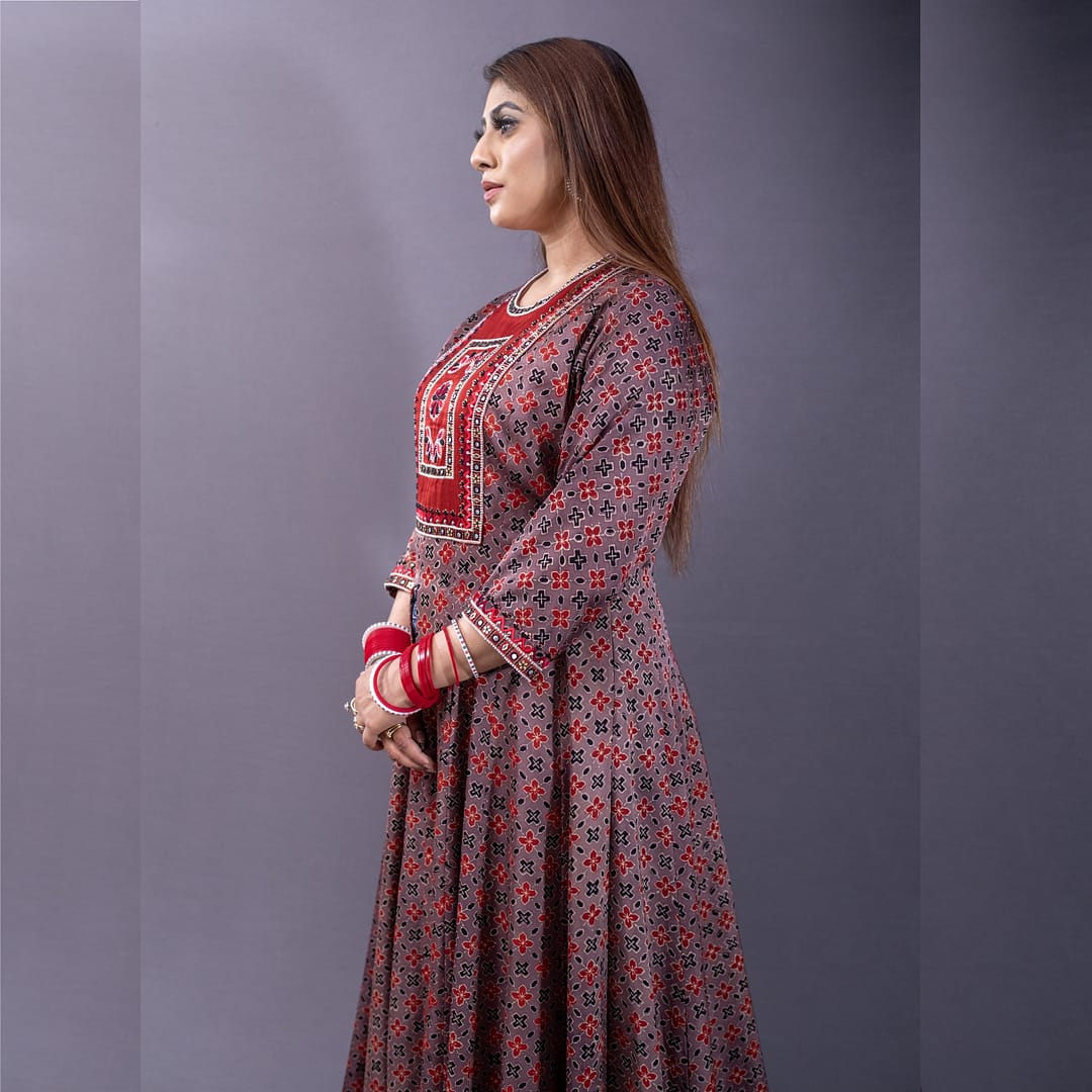 Rust Red Front open Anarkali embellished with zardoz embroidery on the neck and sleeves.